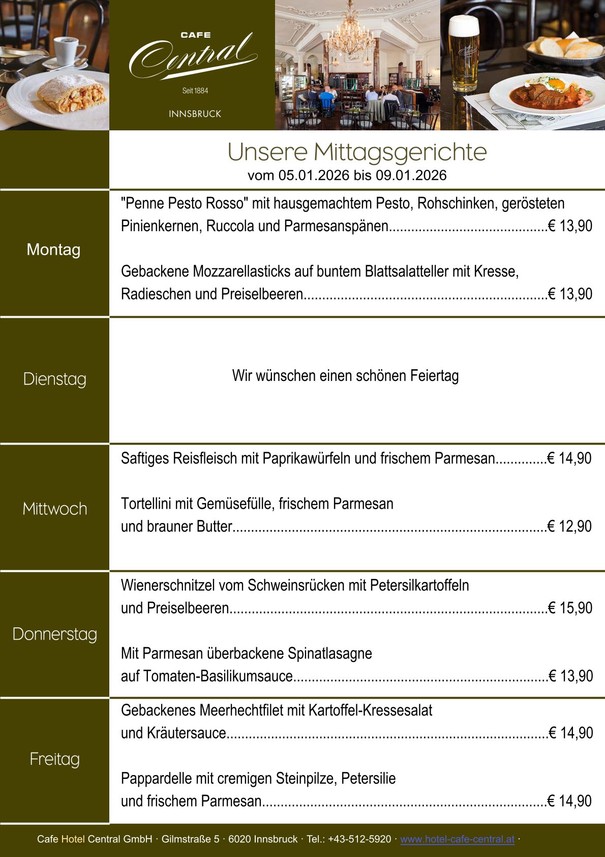 | Central Bauernsalat – Bunter Blattsalatteller mit Tomaten, Gurken, Paprika, hart gekochtem Ei, gebratenem Speck und Knoblauchbaguette | €15,90 |